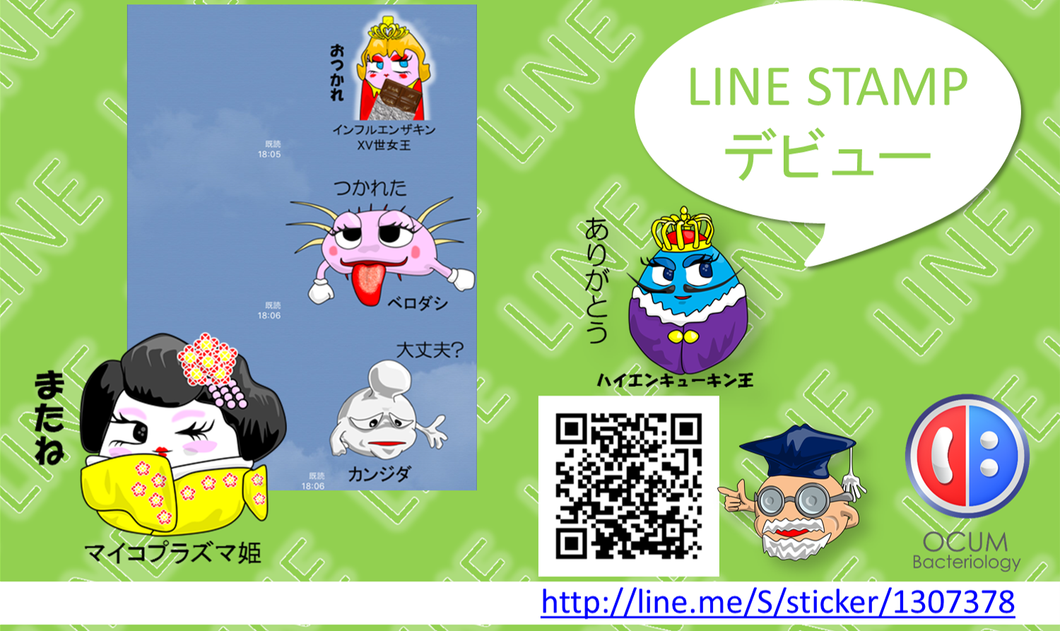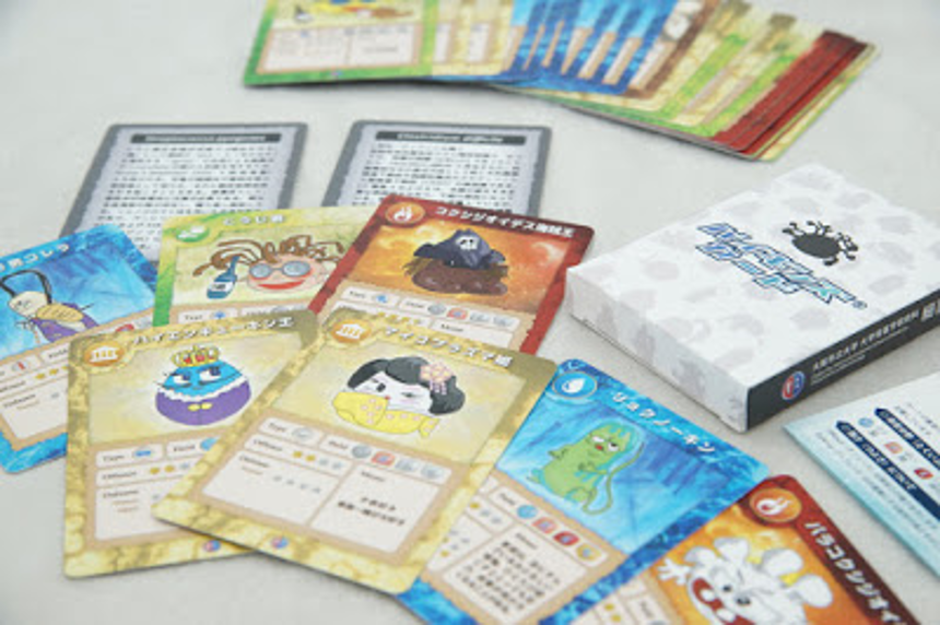 左はLINEスタンプ、右は「バイキンズ®カード」です。バイキンズ®カードは知る人ぞ知る伝説のカード。バイキン(細菌や真菌)をキャラクター化した「バイキンズ®」を掲載したトレーディングカード風のカードです。微生物学習用のカードとして作成していますが、今回、販売に際して、ポーカーのような遊び方を考えました。つまり、遊びながら学べるすぐれもの。32種類のバイキンズ®カードを1セットとして特製紙ケースに入れ、遊び方の説明書を同梱しています。